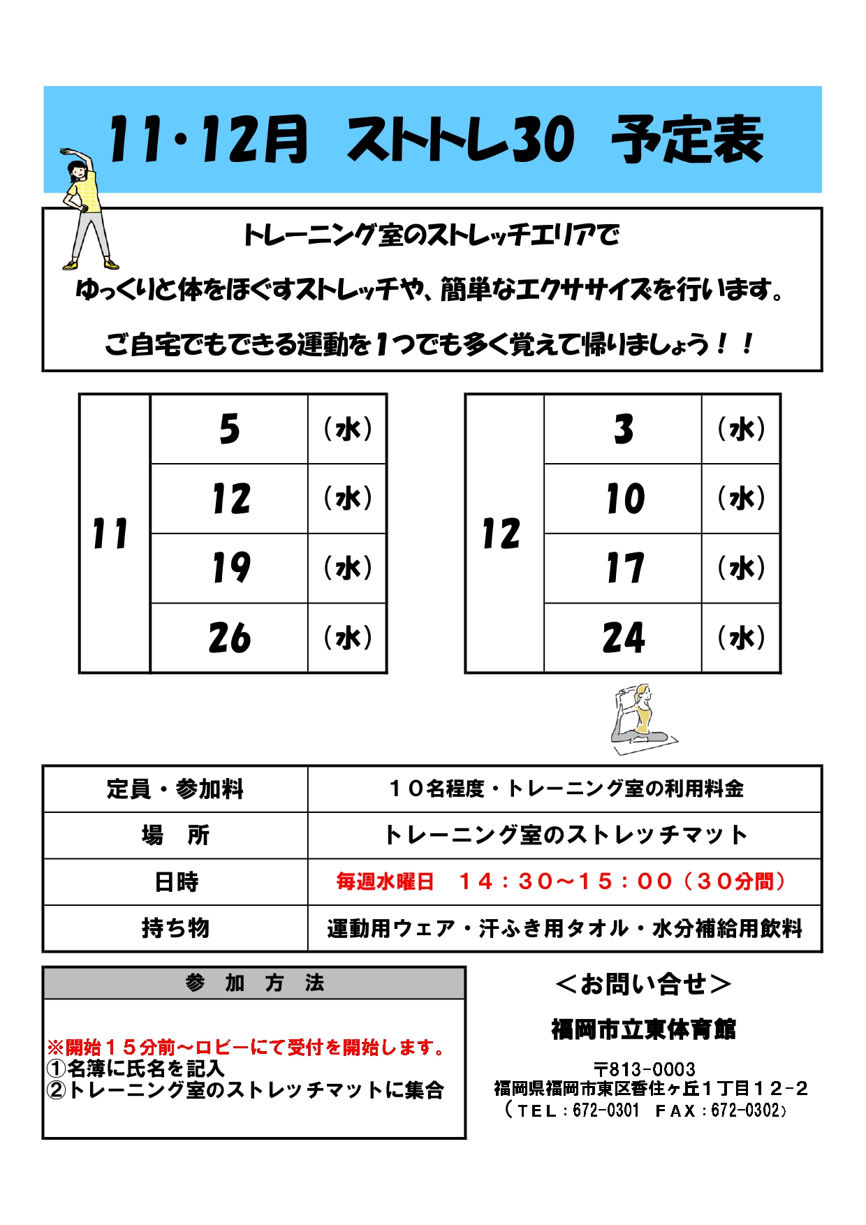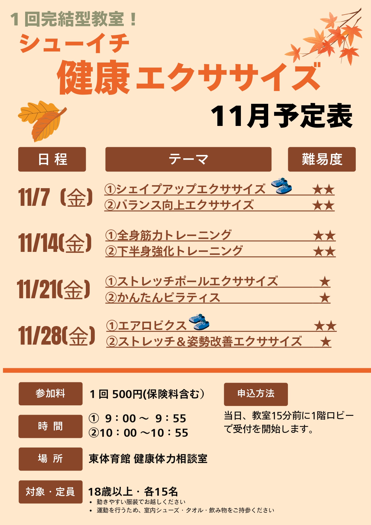 シューイチ健康エクササイズ①② 11月の予定表です。様々なテーマに沿ってトレーニングやストレッチを行う1回完結型の教室です。