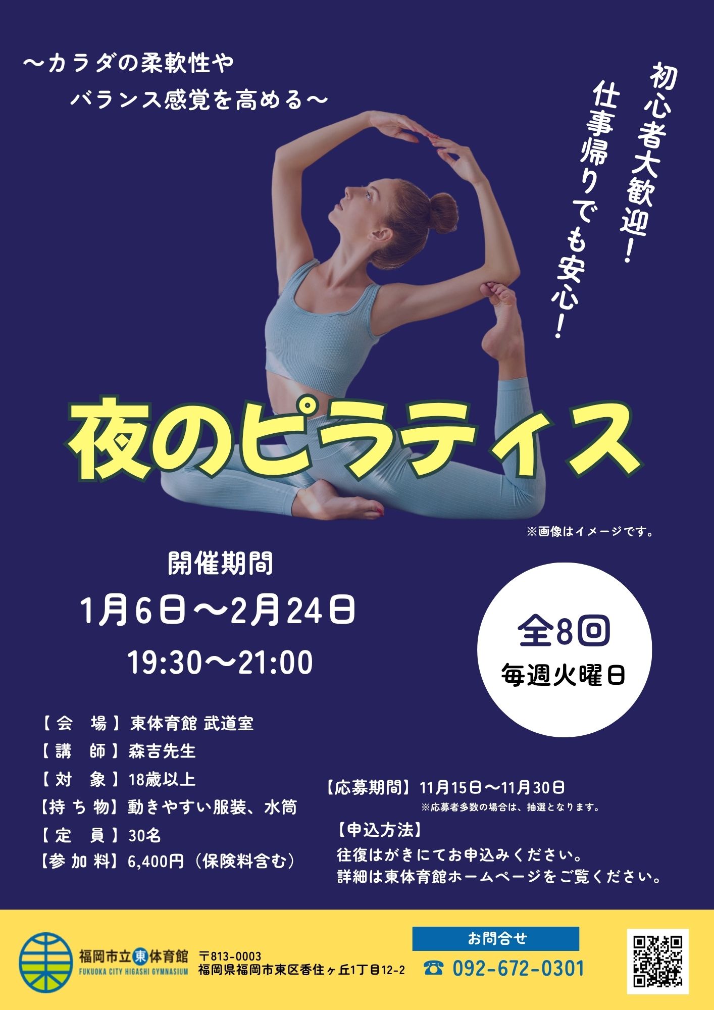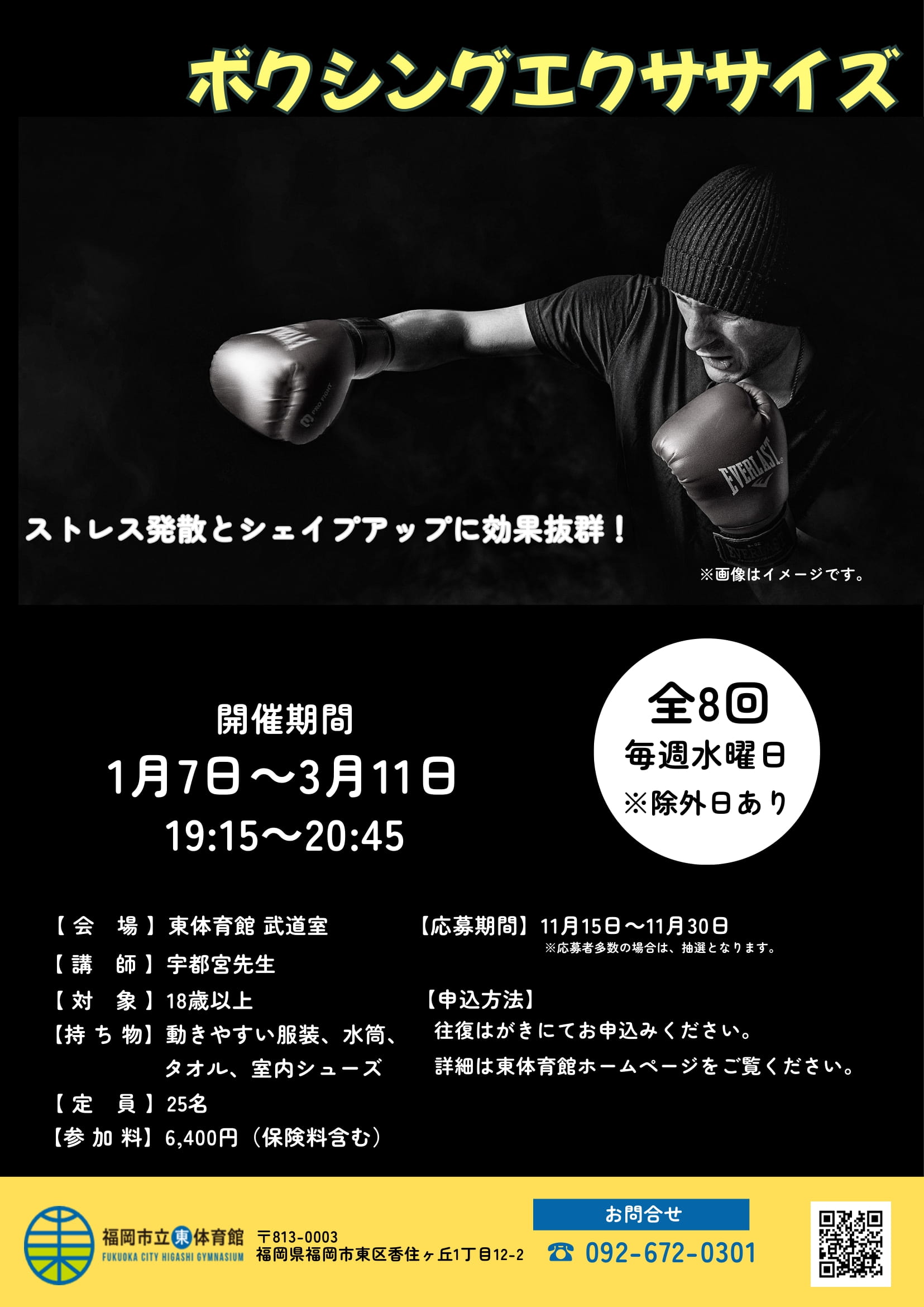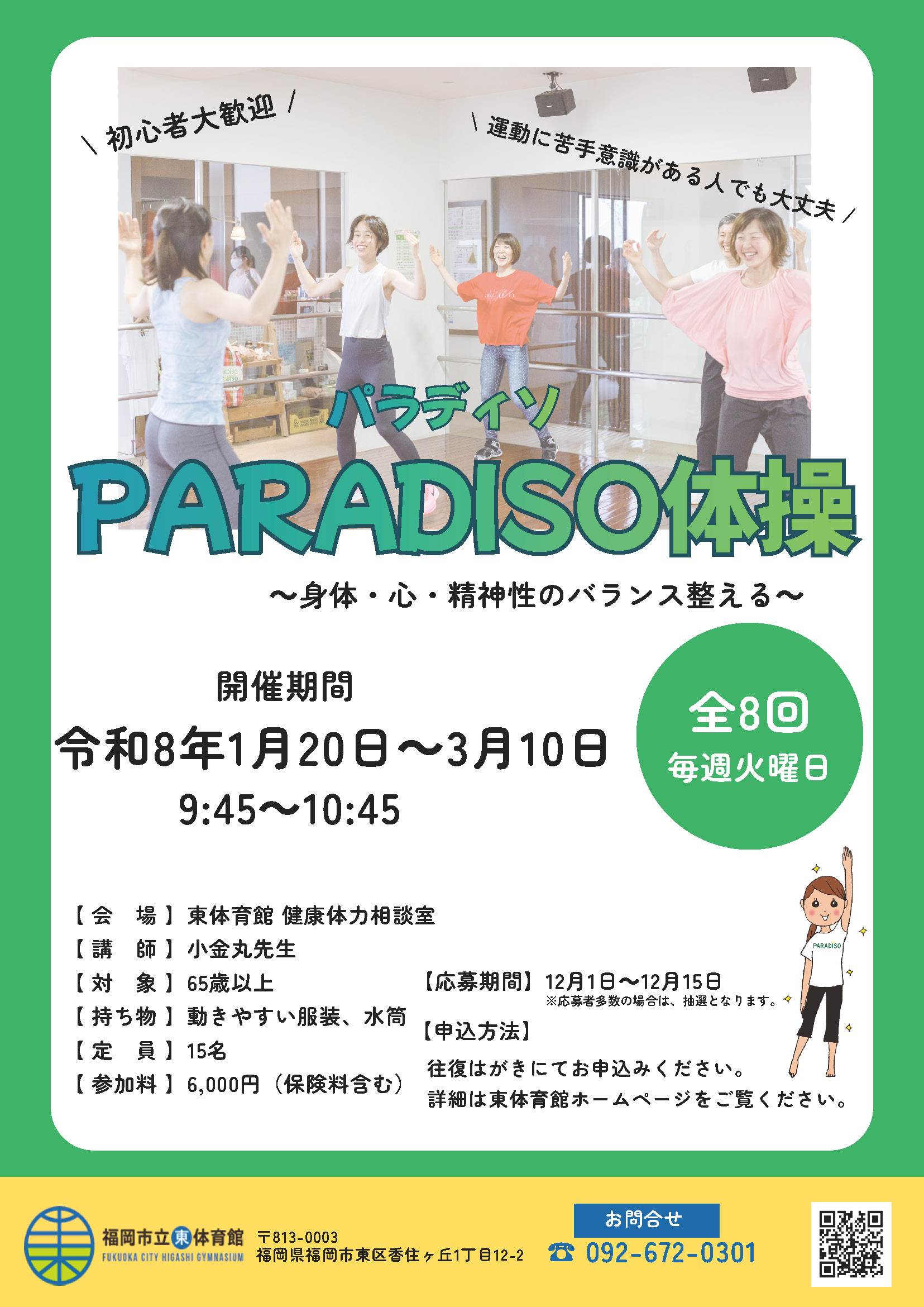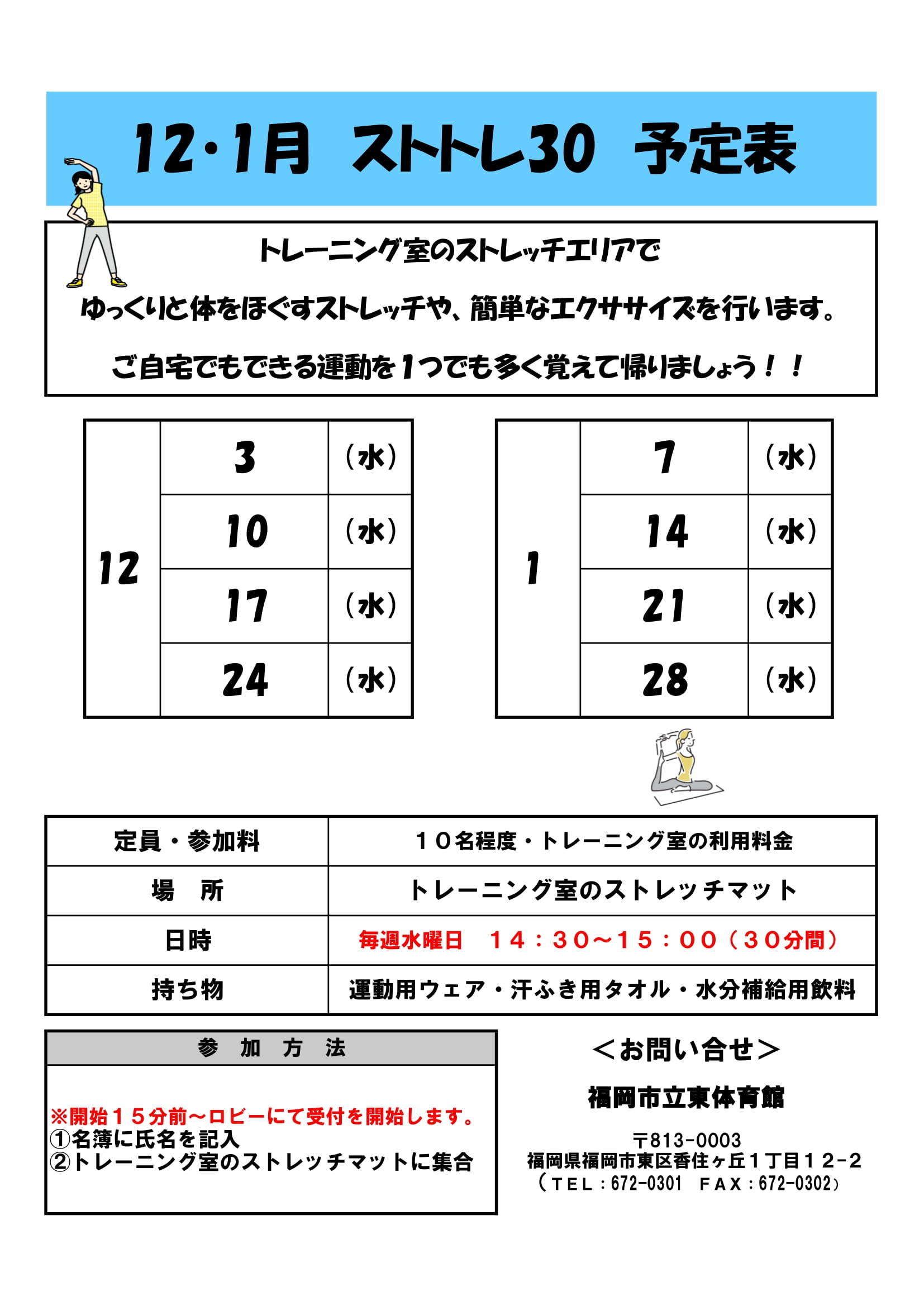 【申込み】往復はがきに教室名・住所・氏名(ふりがな)・年齢・電話番号を記入して東体育館に応募もしくは官製はがきかはがき代85円を持参し、来館にて応募ください。